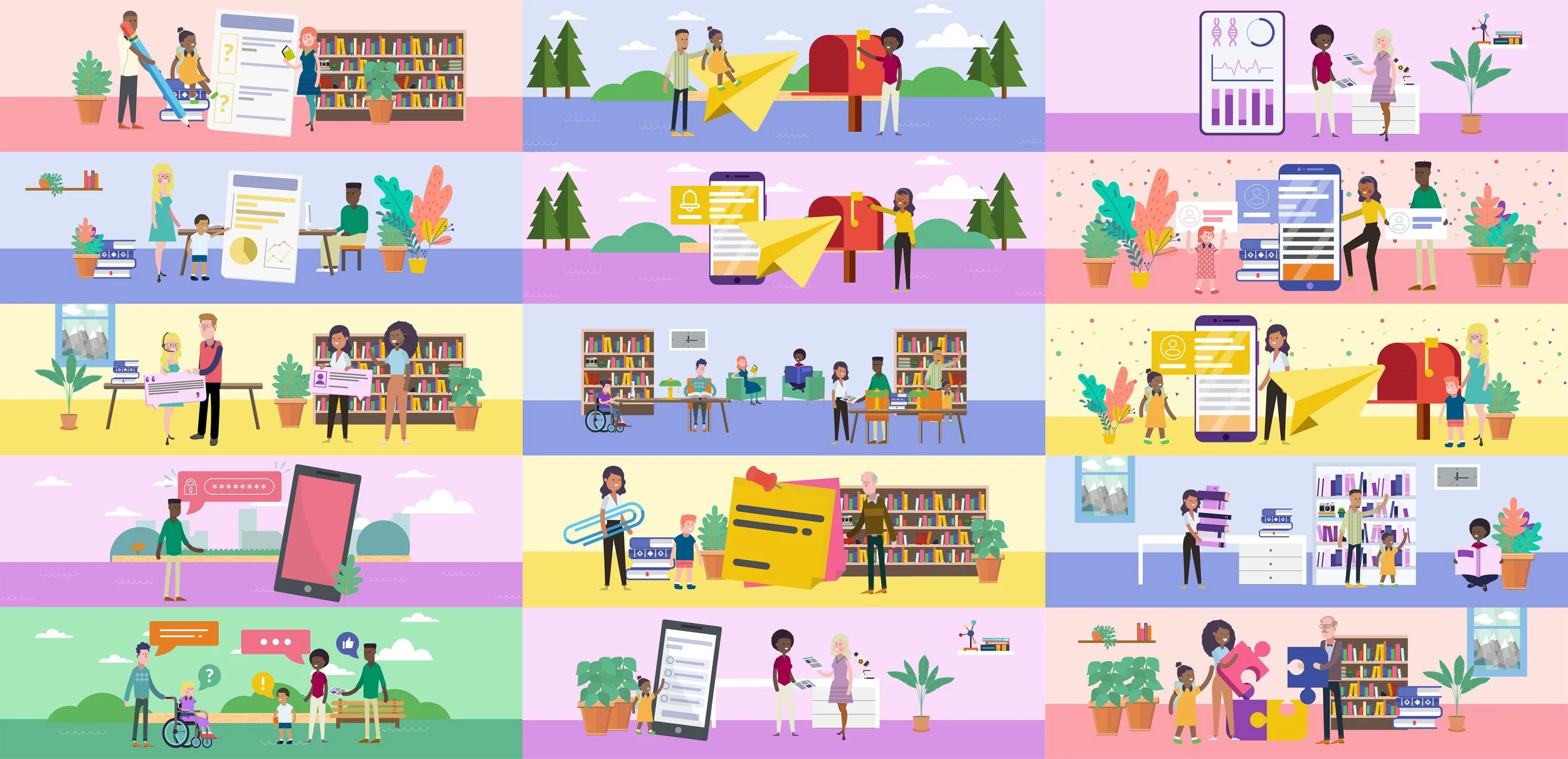 We also took a similar approach in building an illustration library creating resources for backgrounds, characters, and objects so members of the design and marketing team could quickly and effectively produce illustrations representing patients and carers within each community.