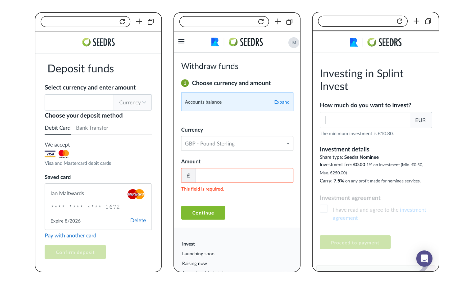 Across Seedrs, various “checkout” journeys handle everything from paying for investments, purchasing shares on the secondary market, depositing funds, and withdrawals.