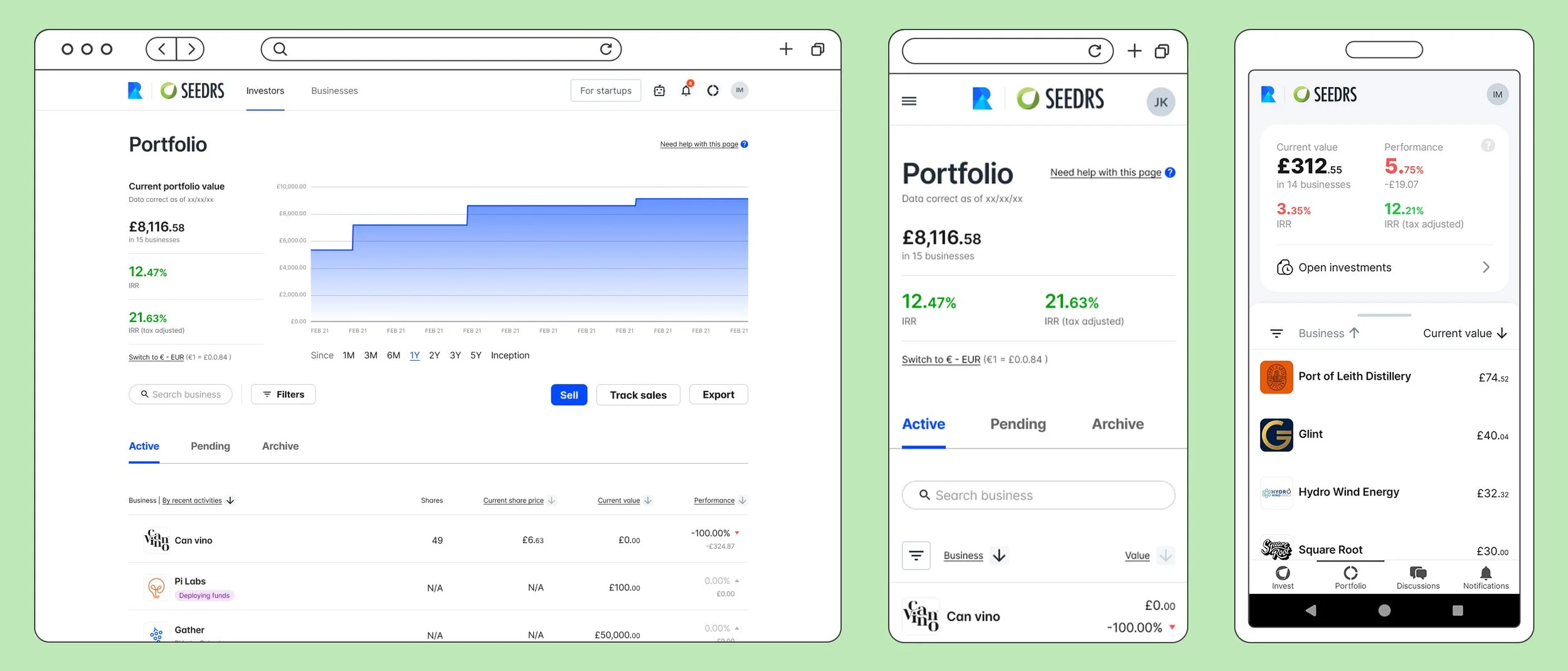 Working closely with the Seedrs app team I implemented a responsive design to ensure the portfolio page worked seamlessly across different devices and screen sizes whilst also providing a consistent journey across the mobile web and the app.